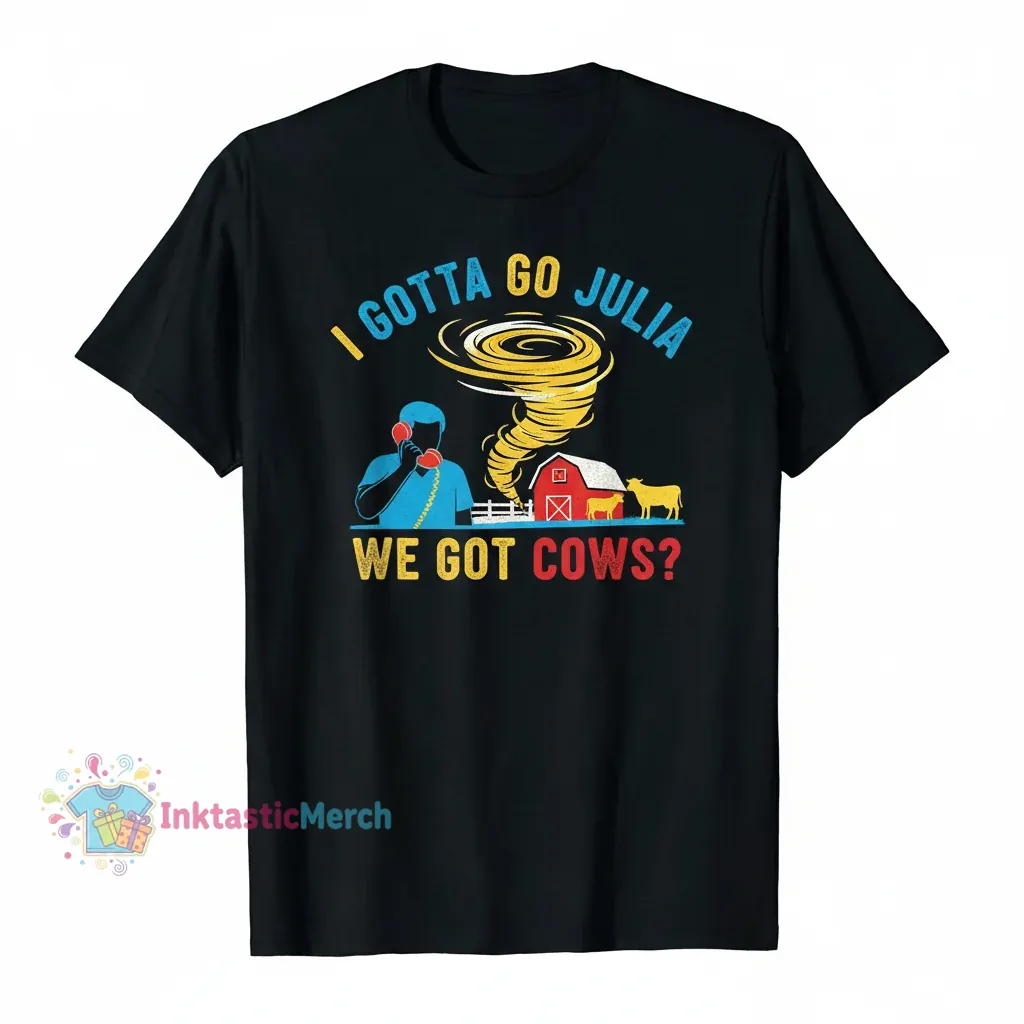 Relive the iconic “I Gotta Go Julia We Got Cows” moment from the Twister movie with this premium quality graphic tee. Crafted from 100% premium ring-spun cotton, this shirt offers lasting comfort and superior feel, embodying the brand’s commitment to quality. Explore more comfortable and stylish apparel at inktasticmerch.com.