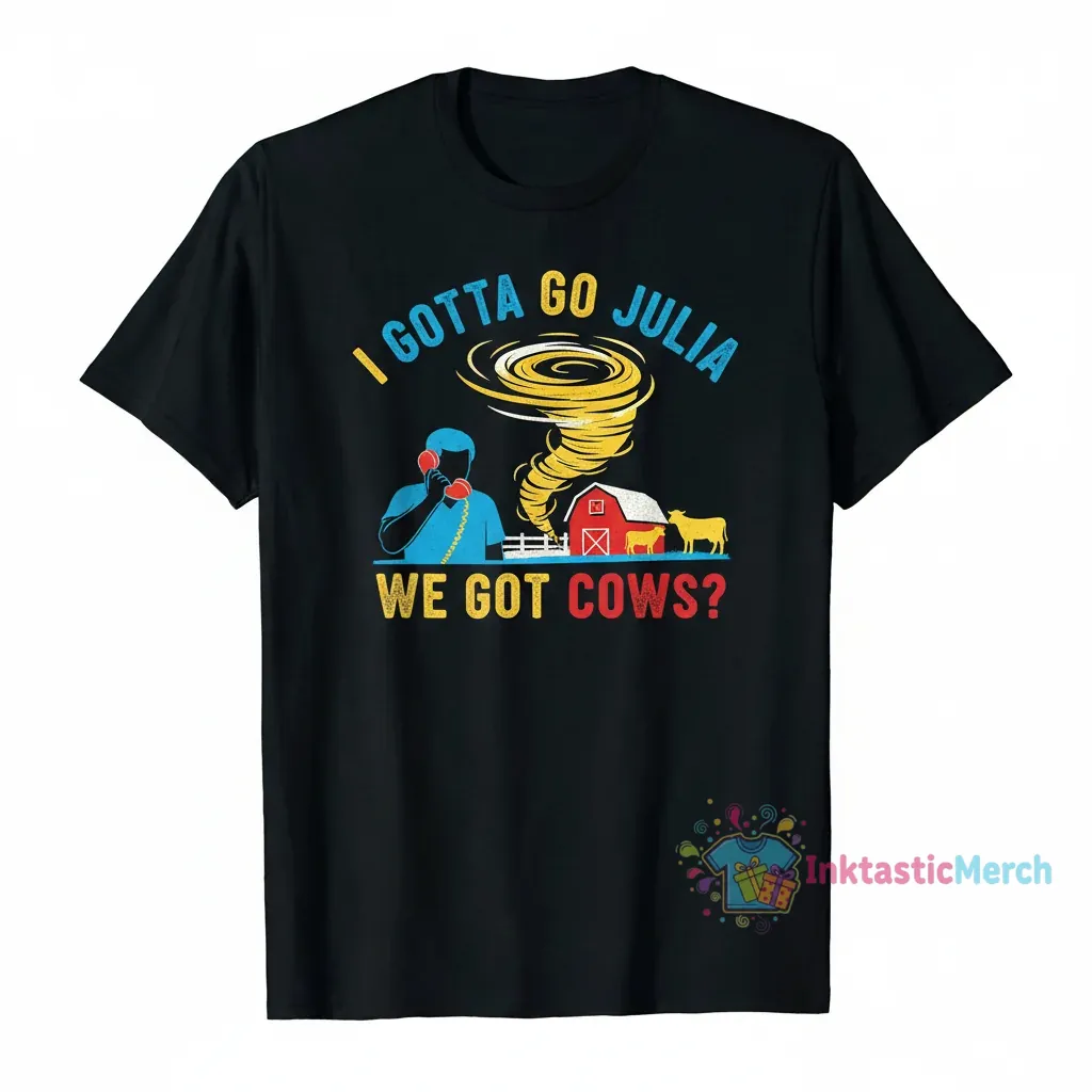 Experience the iconic “I Gotta Go Julia We Got Cows” moment from the beloved Twister movie with this premium quality graphic tee. This shirt is a must-have for fans of the film, featuring a popular Twister meme and paying homage to Jami Gertz’s memorable character, Dr. Melissa Reeves. Designed for comfort and style, this funny tee captures the essence of a classic movie quote, making it a perfect conversation starter for any casual occasion.