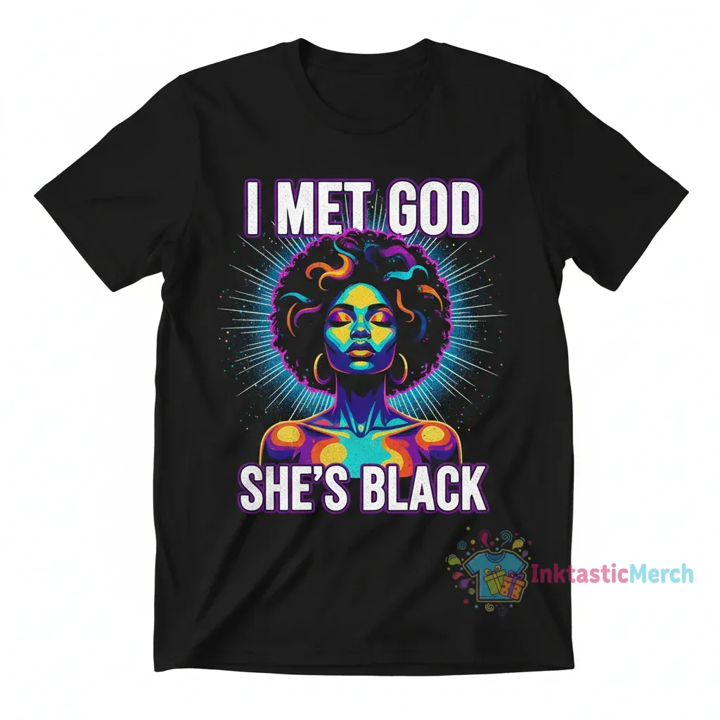 I met God, and she’s black. This shirt is more than just fabric; it’s a powerful declaration, a vibrant celebration of divine feminine energy and the rich beauty of Black womanhood. Inspired by the profound realization that divinity often reflects the faces of those who have historically been marginalized, this design aims to spark conversations and foster a sense of shared spirituality. It’s a reminder that God’s presence is found in all forms, particularly in the strength, resilience, and grace embodied by Black women. Wear it as a testament to your faith, your heritage, and your belief in a more inclusive divine.