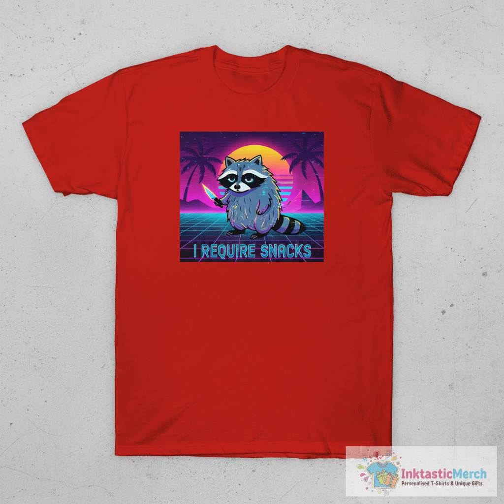 Showcase your humorous side with the “I Require Snacks T-Shirt” from inktasticmerch.com. This tee boasts high-quality, durable prints and super soft, breathable fabric for ultimate comfort, making it a reliable addition to your casual wear. Designed with unique raccoon artwork, it’s perfect for animal lovers and meme enthusiasts alike, blending quirky style with everyday ease.