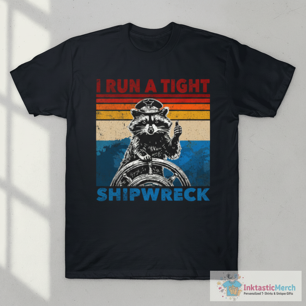 - Unique and humorous “I Run A Tight Shipwreck” raccoon artwork.