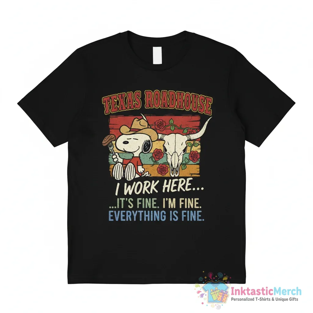 Showcase your love for Texas Roadhouse and Snoopy with this humorous “It’s Fine, I’m Fine, Everything is Fine” t-shirt, designed for comfort and style. Crafted from ultra-soft, premium cotton, this tee features a durable, unique graphic that blends pop culture and everyday life, available at inktasticmerch.com.