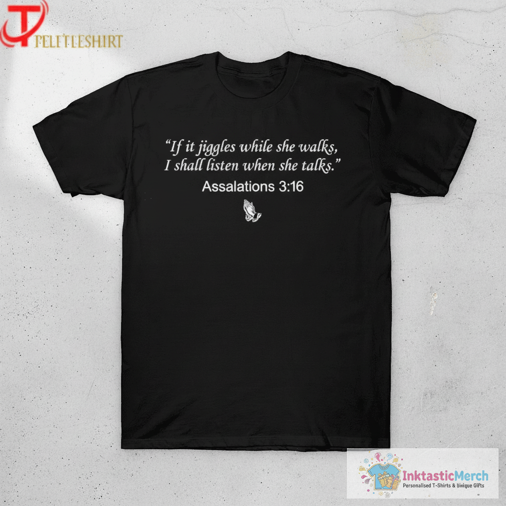 Make a statement with the “If It Jiggles While She Walks I Shall Listen When She Talks Assalations 3:16” T-shirt. This unique tee combines a memorable quote with a bold design, perfect for those who appreciate humor and a good message. Crafted for ultimate comfort, this shirt is sure to become a favorite in your casual wardrobe. Its eye-catching graphic stands out, making it a great conversation starter.
