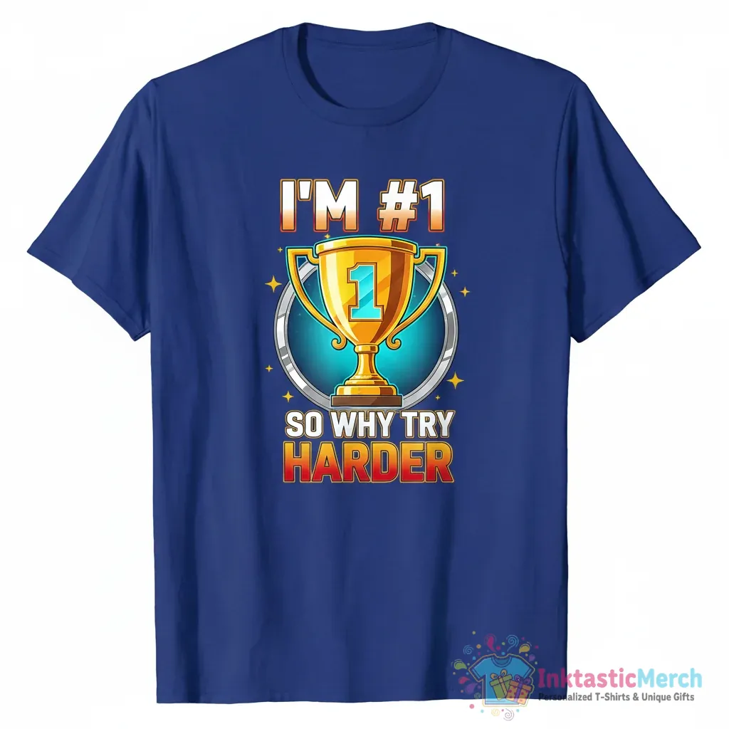 Show off your winning attitude with the I’M #1 SO WHY TRY HARDER T-Shirt from InktasticMerch. Crafted from ultra-soft, premium quality cotton, this tee offers incredible comfort and a durable fabric that holds its shape and color wash after wash, making it a perfect expression of your self-assured style.