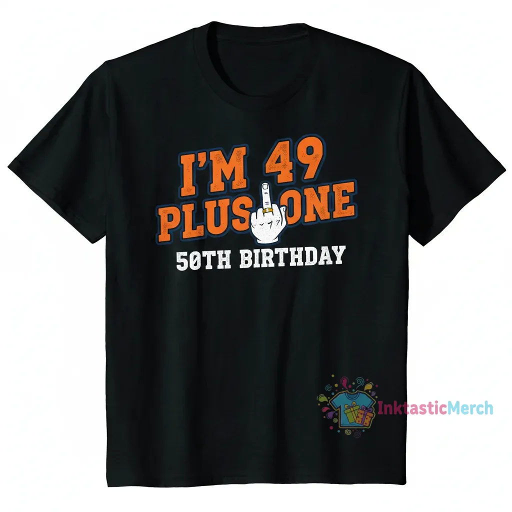 - Unique “I’m 49 Plus One” middle finger graphic for a humorous 50th birthday celebration.