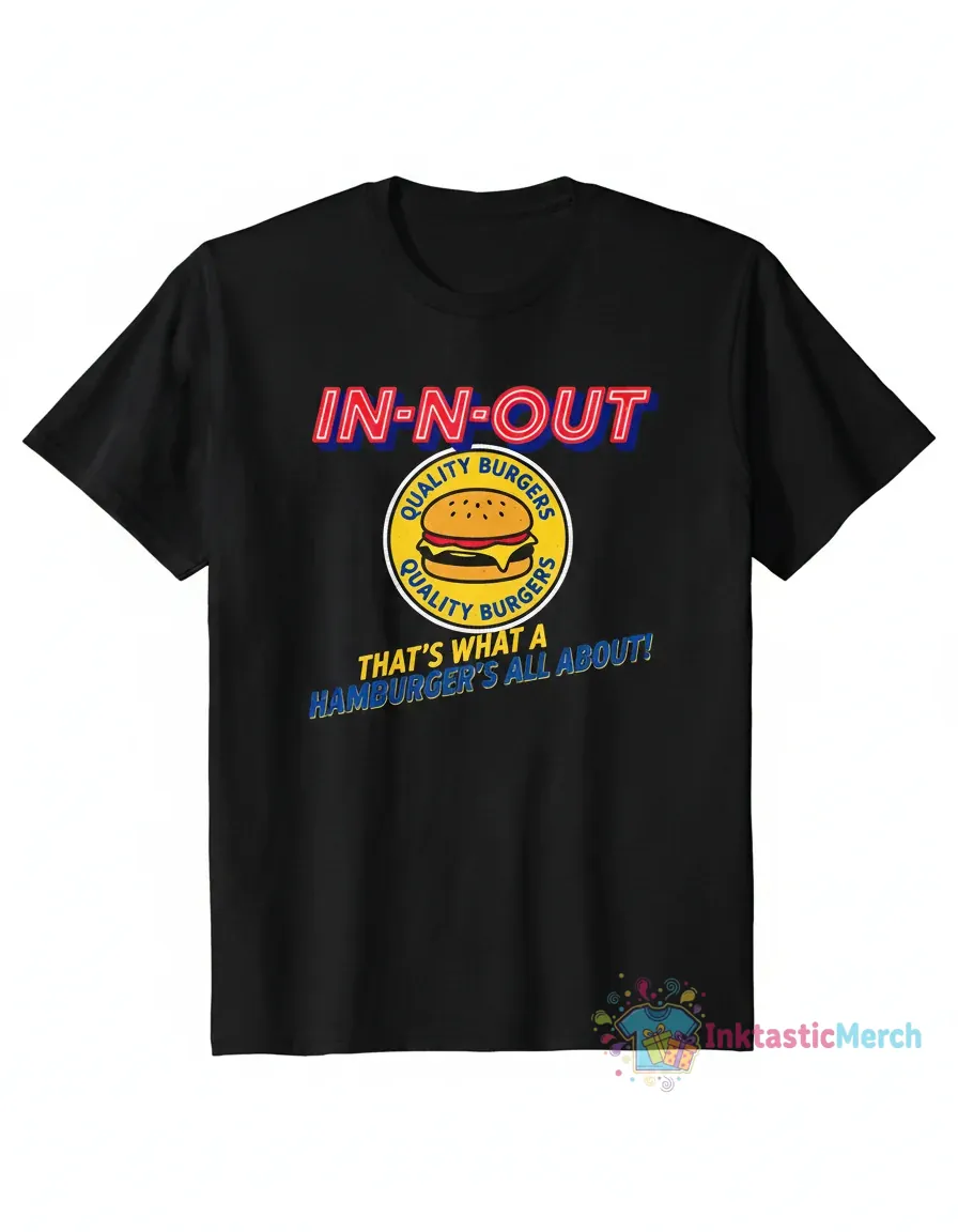 The ‘In N Out Burger That’s What a Hamburger’s All About’ shirt is a must-have for any true In-N-Out enthusiast and fast-food aficionado. This high-quality graphic tee celebrates the iconic slogan of the beloved West Coast burger chain, making it the perfect way to showcase your appreciation for classic American burgers and fries. Designed for comfort and style, this shirt is ideal for casual outings, themed parties, or simply relaxing at home while reminiscing about your favorite menu items. It’s a conversation starter and a declaration of your love for one of the most popular fast-food destinations.