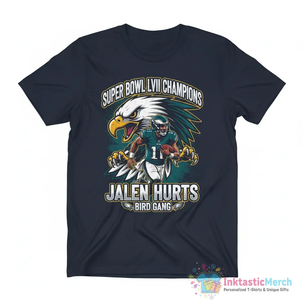 Celebrate the Philadelphia Eagles and their MVP quarterback with this premium Jalen Hurts Super Bowl Champions Bird Gang shirt from InktasticMerch. Crafted from incredibly soft, high-quality fabric, this shirt offers ultimate comfort and a vibrant design, making it a must-have for any dedicated fan.