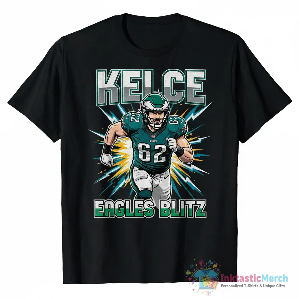 Show your Eagles pride with the Jason Kelce 62 NFL Blitz Philadelphia Eagles shirt! Crafted from super-soft, premium fabric with a comfortable unisex fit, this tee combines classic style with modern comfort, perfect for any devoted fan. Discover more quality apparel at inktasticmerch.com.