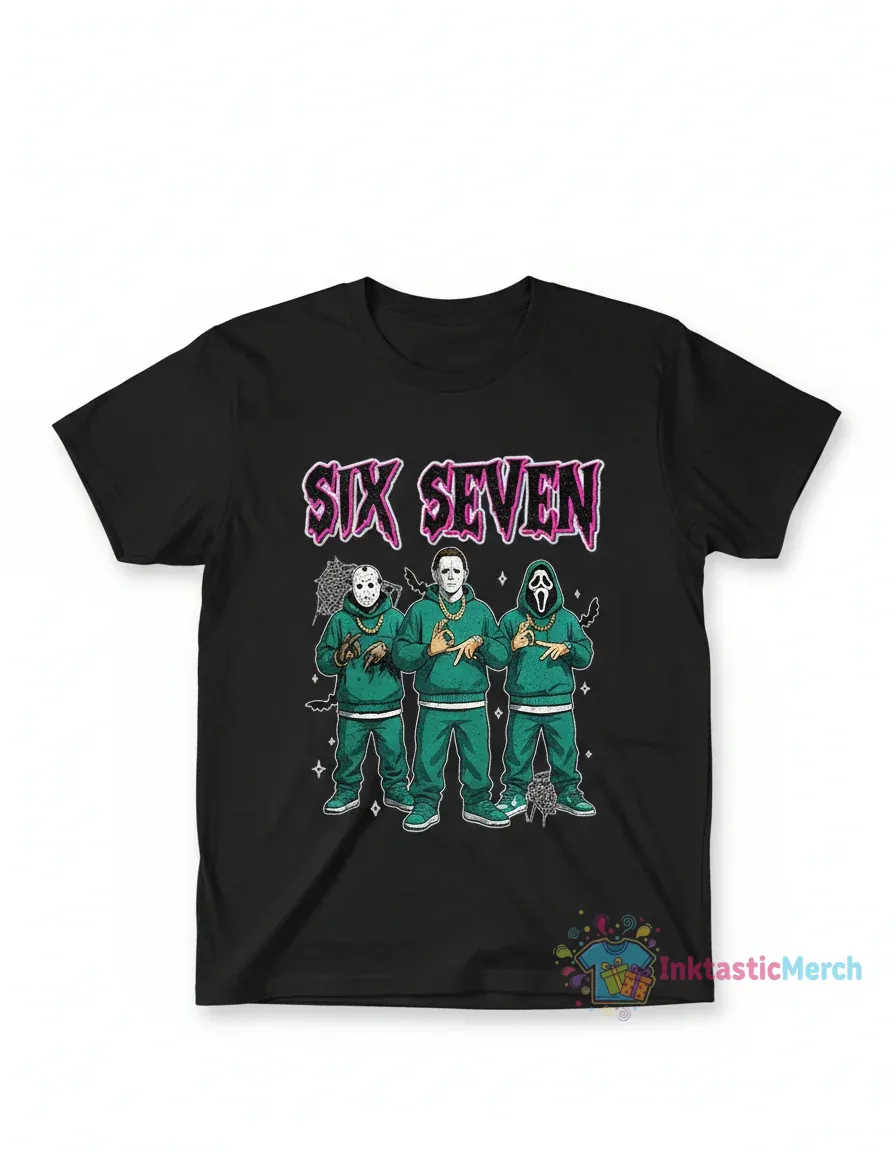 The Jason Voorhees Michael Myers Ghostface Six Seven Meme T-Shirt is a must-have for any fan of iconic horror movie villains and internet meme culture. This unique graphic tee combines the legendary figures of Jason Voorhees from Friday the 13th, Michael Myers from Halloween, and Ghostface from Scream, all brought together in a humorous ‘Six Seven’ meme design. Perfect for casual wear, movie marathons, or as a standout gift for horror enthusiasts, this shirt captures the essence of slasher film fandom with a contemporary, comedic twist. Show your appreciation for horror’s greatest antagonists and your love for internet humor with this distinctive and conversation-starting apparel.