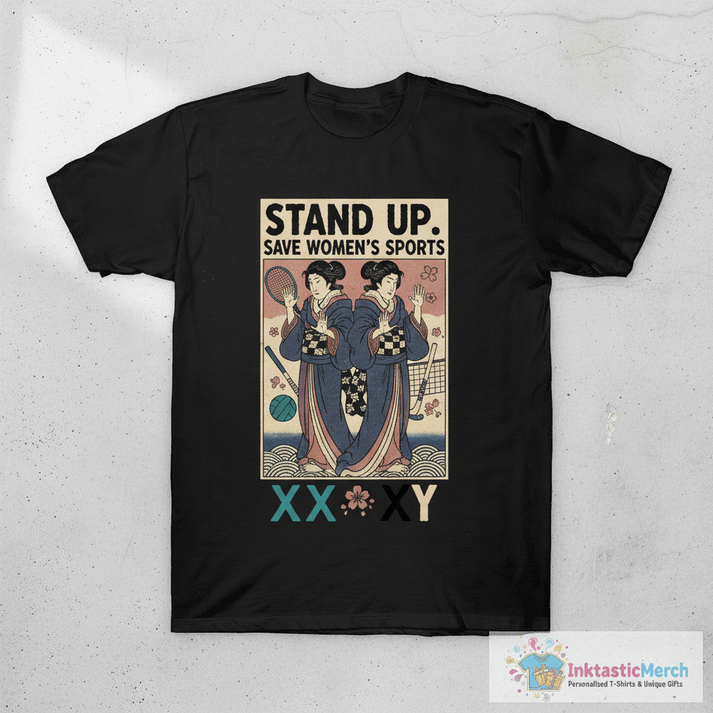 - Unique “Stand Up Save Women’s Sports XX XY” graphic design.