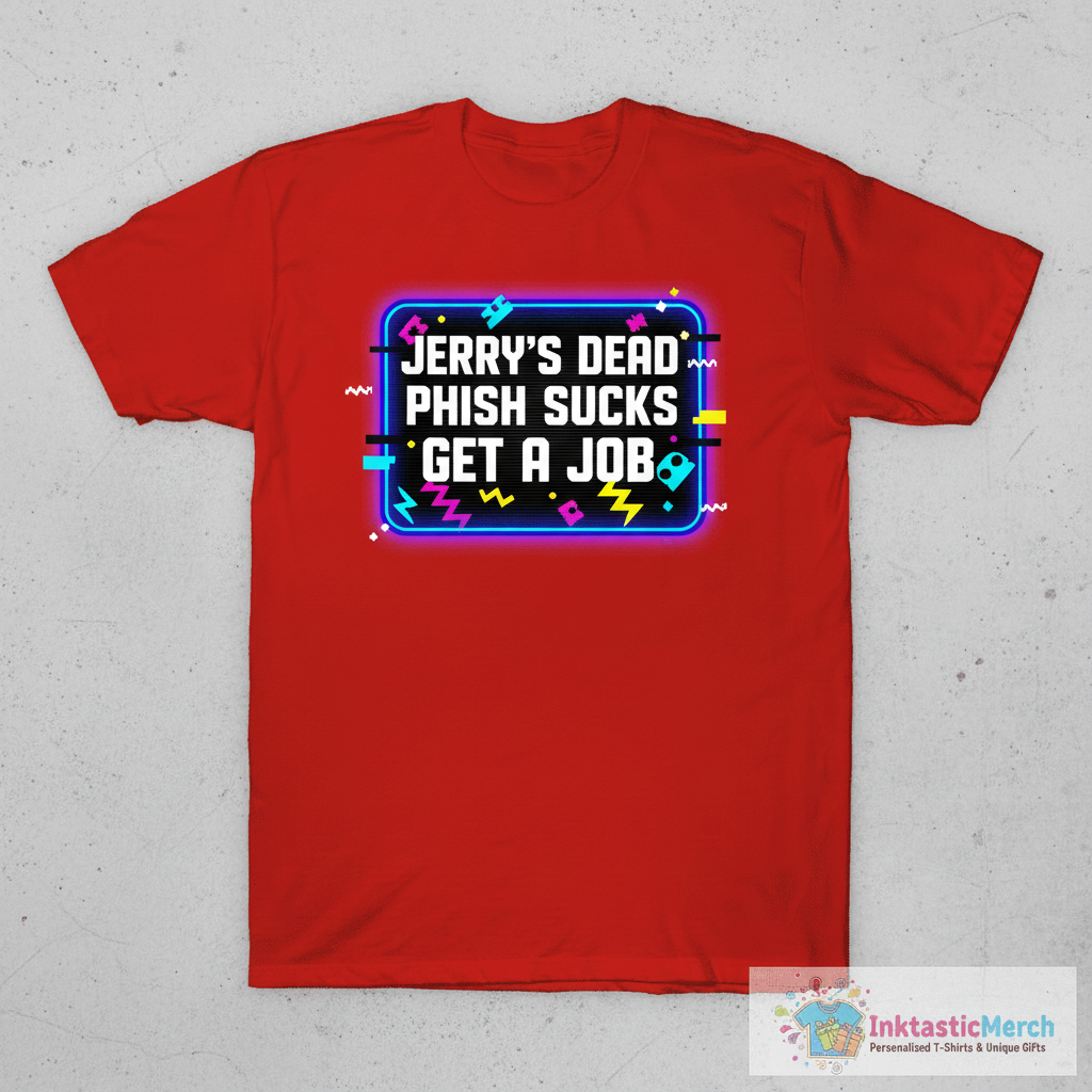 Bring your style to life with the Jerry’s Dead Phish Sucks Get A Job T-Shirt today!