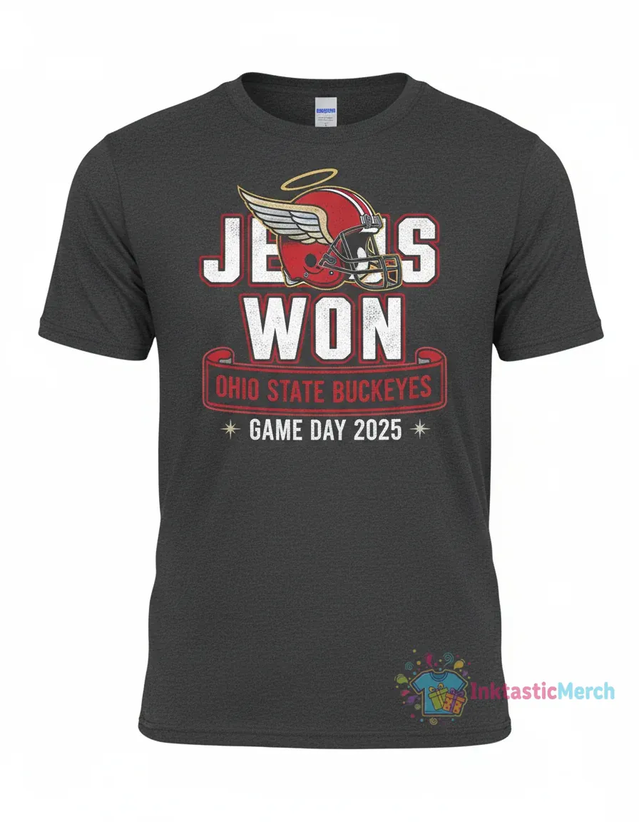 Celebrate faith and fandom with the Jesus Won Ohio State Buckeyes Game Day 2025 T-Shirt, a must-have for any dedicated supporter heading into the 2025 season. This uniquely designed shirt blends spiritual conviction with passionate allegiance to the Ohio State Buckeyes, making it the perfect attire for game days, watch parties, or everyday wear to showcase your dual pride. Crafted for comfort and style, it’s an ideal way to express your beliefs while cheering on your favorite team. This shirt is designed to be a conversation starter and a statement piece for fans who hold both their faith and the Buckeyes close to their heart, ensuring you stand out from the crowd with its distinctive message and team spirit.