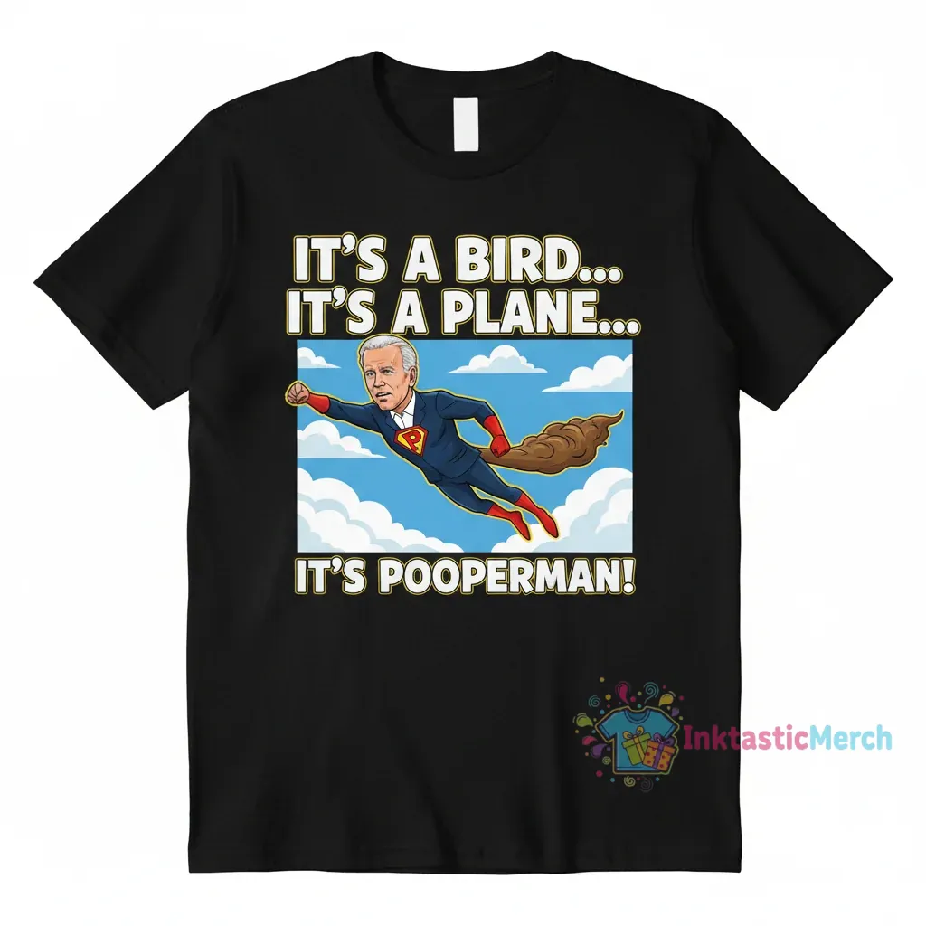 Joe Biden: It’s a bird, it’s a plane, it’s Pooperman! This shirt is more than just apparel; it’s a conversation starter and a nod to those moments of unexpected, larger-than-life commentary. Inspired by the dynamic energy of political discourse and the playful twist of pop culture, our artists have captured a unique spirit. It’s a design that embraces the humor and the narrative that surrounds public figures, turning everyday observations into wearable art. We wanted to create something that feels both relevant and fun, sparking smiles and thoughtful reflection with every glance.
