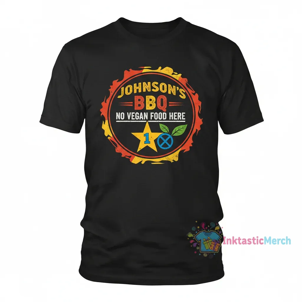 Show off your sense of humor and love for good food with the Johnson’s BBQ “No Vegan Food Here” One Star T-Shirt from InktasticMerch. This classic tee is made for everyday wear, combining comfort with a bold statement graphic that’s sure to get a reaction and spark conversations. Crafted from an ultra-soft, premium cotton blend with a durable, fade-resistant print, it offers a relaxed, confident vibe perfect for barbecues and casual get-togethers.