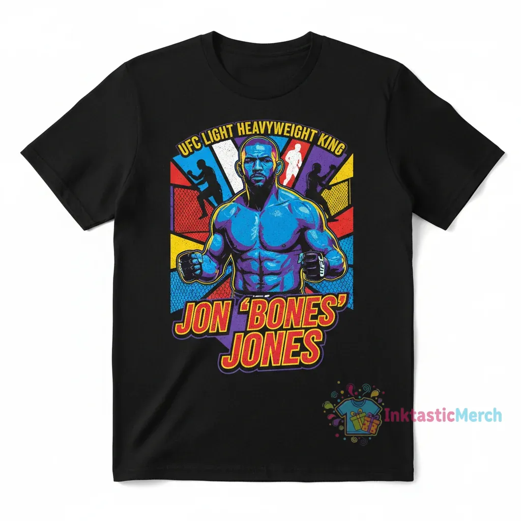 This Jon Jones UFC Collage T-Shirt is the ultimate piece of officially licensed MMA fan apparel, celebrating ‘Bones’ iconic career. Crafted for lasting comfort and a superior feel, this tee features a dynamic collage graphic and is made from 100% ring-spun cotton, ensuring a soft touch and excellent durability. Discover more at inktasticmerch.com.