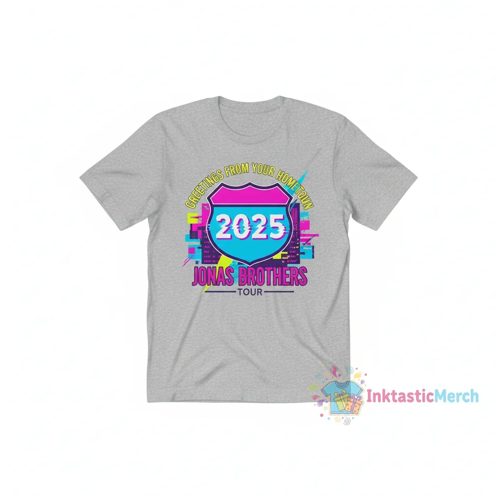 Show your support for the Jonas Brothers on their highly anticipated Greetings From Your Hometown 2025 Tour with this officially licensed tour shirt. Crafted from 100% premium ring-spun cotton, this tee offers exceptional softness and breathability, ensuring long-lasting wear thanks to its pre-shrunk fabric and durable side-seamed construction, available from InktasticMerch.
