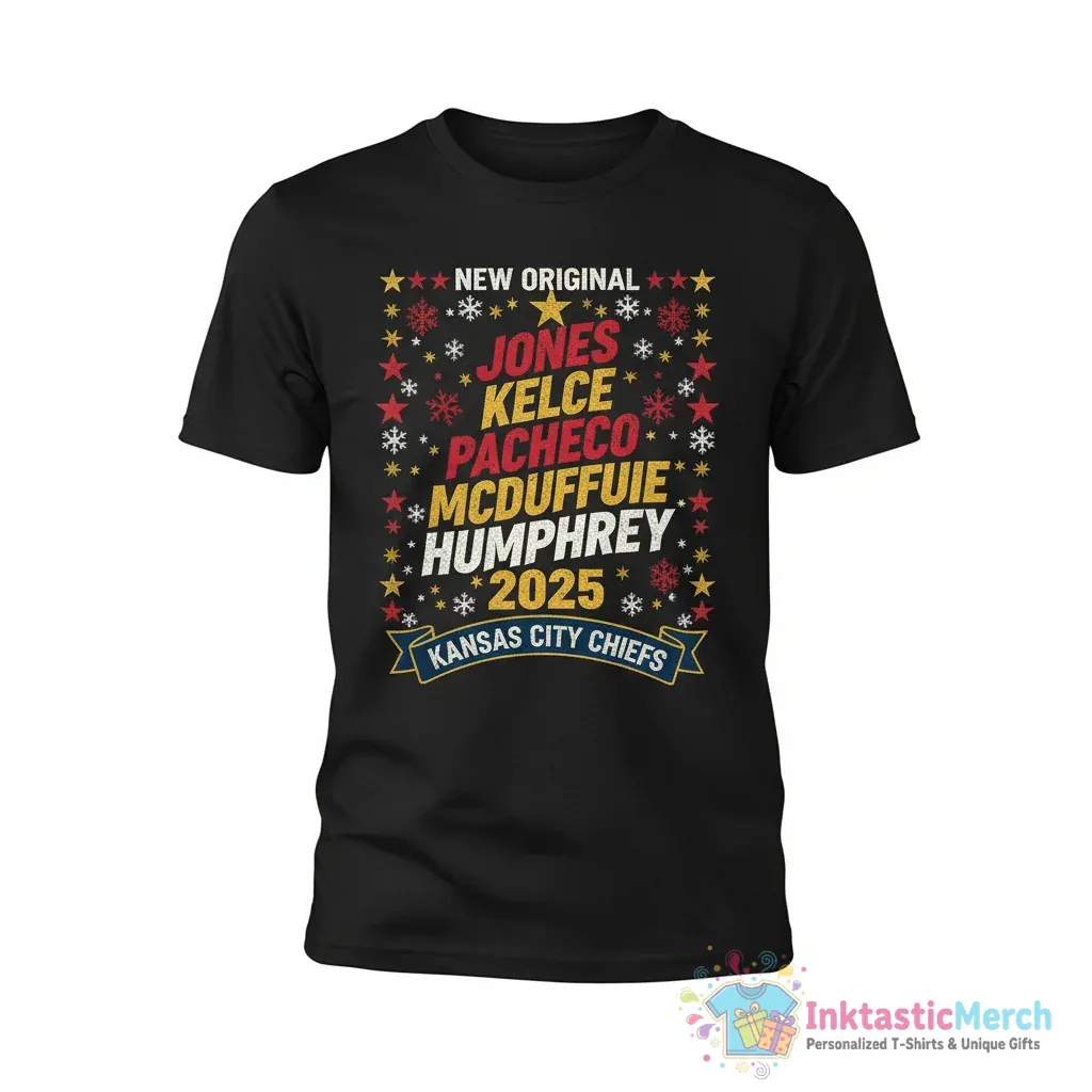 Show your Kansas City pride with the festive Jones Kelce Pacheco Mahomes McDuffie Humphrey Kansas City Chiefs Christmas Tree 2025 shirt. Made with high-quality, soft, and breathable fabric, this shirt offers both comfort and style, making it a standout addition to any fan’s collection, available at inktasticmerch.com.
