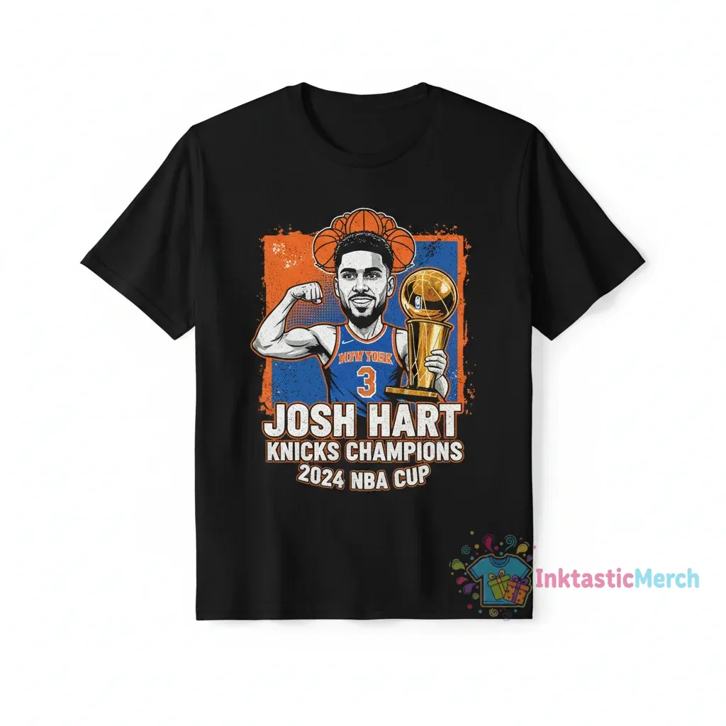 This caricature shirt celebrates the Josh Hart and New York Knicks’ NBA Cup Championship, capturing the electric energy of the victory. Crafted with premium, breathable fabric and expertly screen-printed original artwork, it offers unparalleled softness for a feeling of pure victory, making it a cherished piece from InktasticMerch.