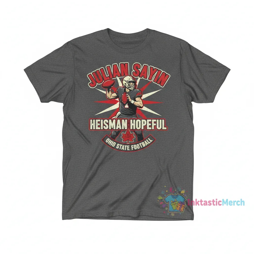 Show your support for Julian Sayin and the Ohio State Buckeyes with this must-have Heisman Trophy contender football shirt! Crafted for ultimate comfort and featuring a dynamic design, it’s perfect for game days or any occasion to cheer on your favorite player. Discover more from InktasticMerch.