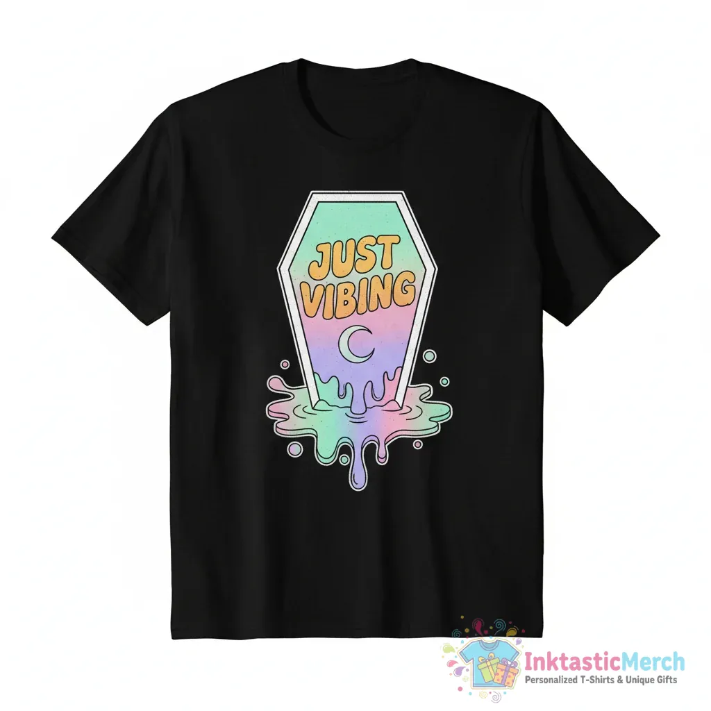 Embrace your unique style and stay super comfortable with the Just Vibing Pastel Drip Melting Coffin T-Shirt from InktasticMerch. Made from super-soft, high-quality fabric with a relaxed unisex fit, this statement piece features eye-catching pastel drip artwork on a cool coffin shape, perfect for expressing your personality and aesthetic.