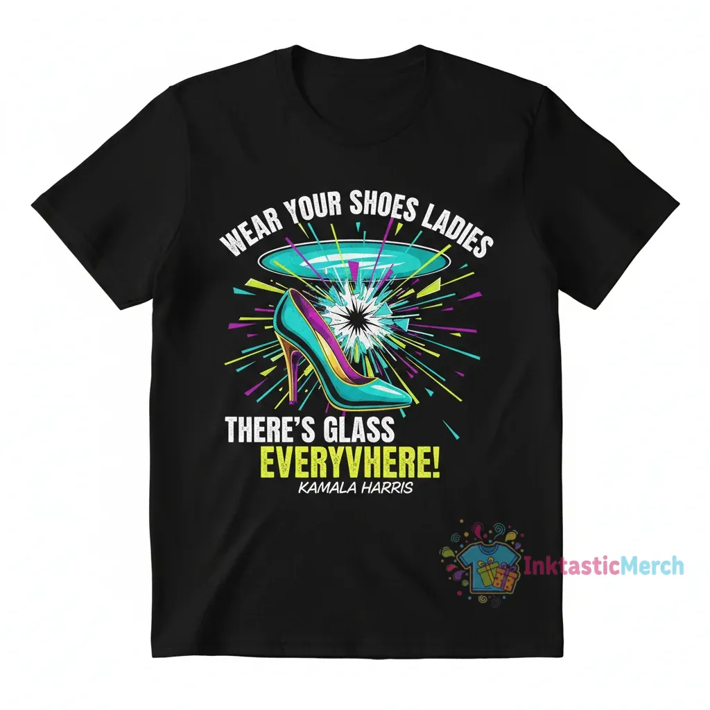 - Unique Kamala Harris-inspired graphic design: “Wear Your Shoes Ladies, There’s Glass Everywhere.”