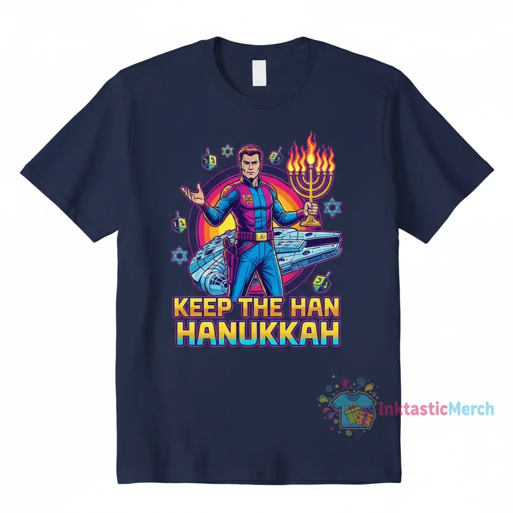 Celebrate the Festival of Lights with humor and comfort in this ‘Keep the Han in Hanukkah’ t-shirt from InktasticMerch. Crafted from 100% ring-spun cotton with a pre-shrunk, retail fit and side-seamed construction, this shirt offers superior softness, breathability, and lasting wear for all your festive gatherings.