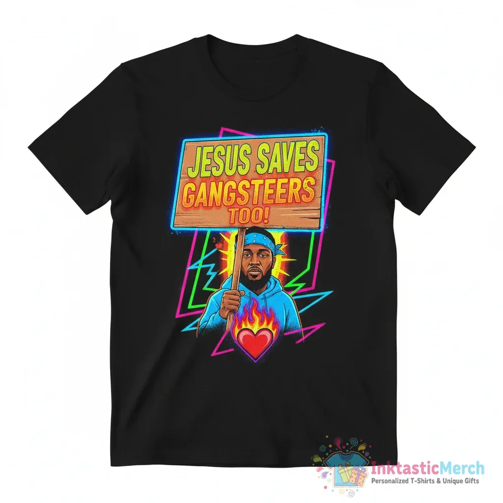 Bring your style to life with the Kendrick Lamar Holding Jesus Saves Gangsters Too shirt today!