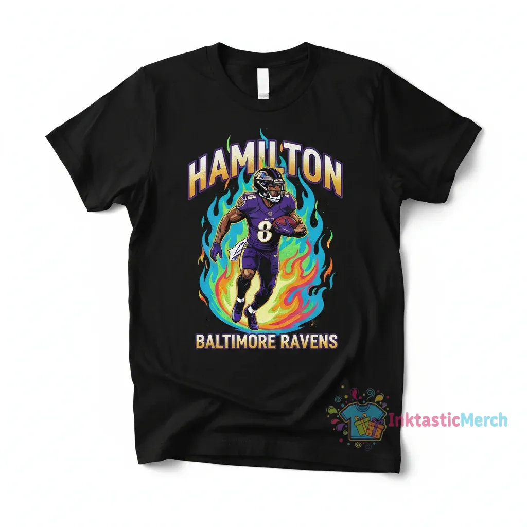 Show your team spirit with the striking Kyle Hamilton Baltimore Ravens Aura Flame Shirt, crafted for ultimate comfort and durability. This eye-catching graphic embodies the passion and intensity of football, making it perfect for game days or casual outings. Discover more unique fan apparel at inktasticmerch.com.