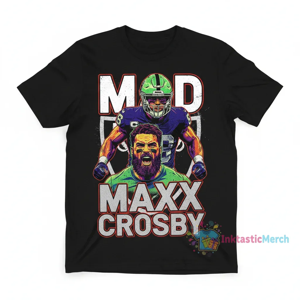Show your unwavering support for the Las Vegas Raiders and star defensive end Maxx Crosby with this must-have player graphic t-shirt from InktasticMerch. Crafted from a premium fabric blend of ultra-soft cotton, this tee offers exceptional comfort and breathability, making it a bold statement piece for any fan. Built to be durable and long-lasting, it features a vibrant player graphic designed to withstand countless washes while maintaining its shape and color.