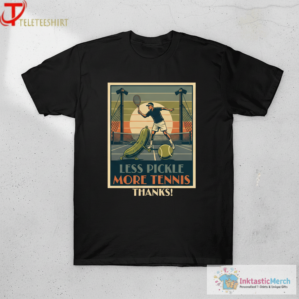 Step up your game with the Less Pickle More Tennis Thanks T-shirt from InktasticMerch. Crafted from an ultra-soft, breathable cotton blend, this tee offers premium comfort and a durable, vibrant print designed to last. Its versatile unisex fit makes it the ideal addition to your casual wardrobe, perfect for making a statement on and off the court.
