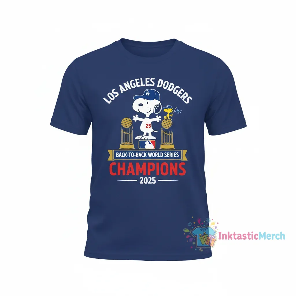 Celebrate the Los Angeles Dodgers’ unforgettable 2025 World Series Back To Back Championship with this apparel, crafted for unparalleled comfort and durability. Featuring exclusive original artwork of Snoopy and the victorious Dodgers, this shirt offers a buttery softness and resilient construction, ensuring it becomes a cherished piece of wearable history from inktasticmerch.com.