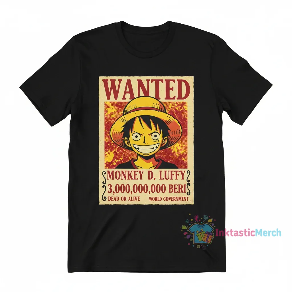 Showcase your love for One Piece with the high-quality Luffy Wanted Poster Anime T-Shirt from InktasticMerch. Crafted from 100% ring-spun cotton, this durable and comfortable tee features a vibrant, detailed print designed for longevity and a flattering retail fit.