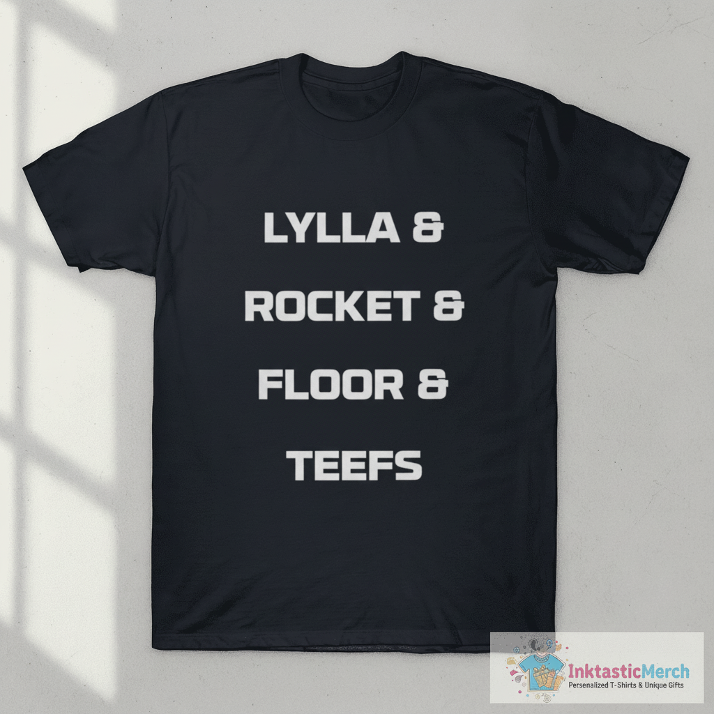 Fans of Lylla, Rocket, and Teefs, casual everyday wear, movie nights, comic conventions, gifting, or simply adding a fun graphic tee to your collection. This shirt is ideal for anyone who loves comfortable, stylish apparel with a pop culture twist.