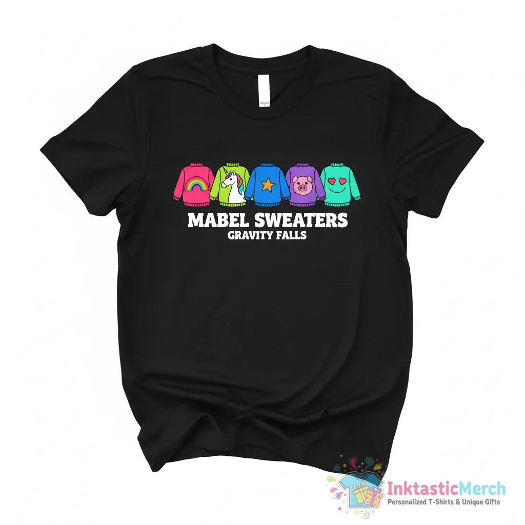 Embrace your inner Mabel Pines with this ultra-soft, premium quality T-shirt from InktasticMerch. Crafted with the softest materials for all-day comfort and featuring a durable, vibrant print of the unique Mabel Sweaters Gravity Falls graphic, this tee is built to last and designed to impress any fan.