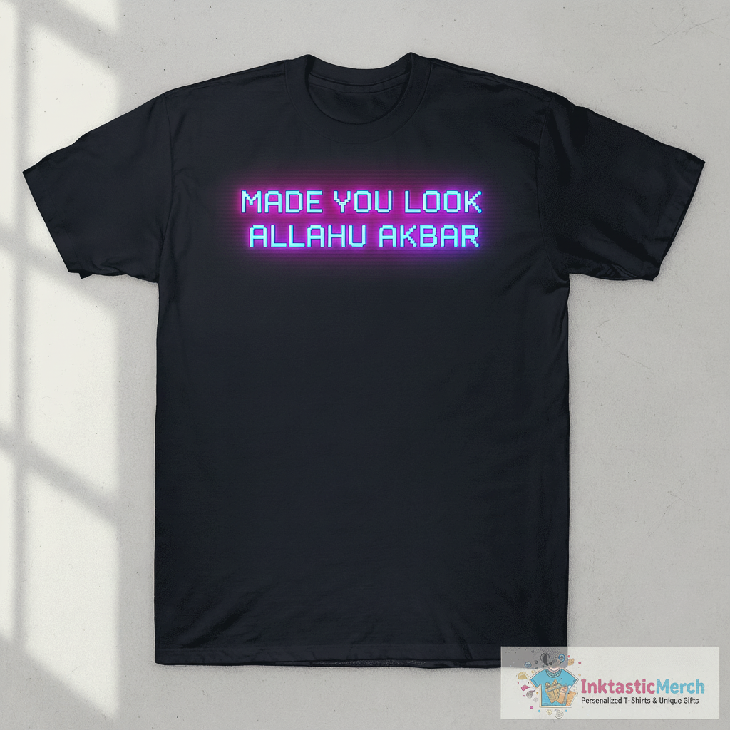Turn heads and spark conversations with the “Made You Look Allahu Akbar” T-shirt from InktasticMerch. Crafted for ultimate comfort and style with a premium fabric blend, this tee is designed to express your unique perspective. Its durable print ensures the bold design stays vibrant wash after wash, making it a standout addition to any outfit.