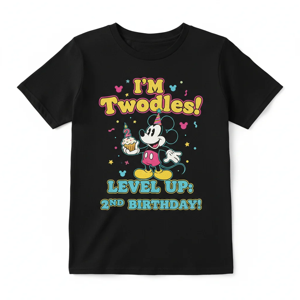 Our ‘I’m Twodles’ design was born from the whimsical world of beloved mouse characters and the sheer excitement of a child’s second birthday. We envisioned a design that radiates pure happiness and playful charm, celebrating the big leap from one to two. Each element of this original artwork is crafted to spark imagination and bring a smile to every face, making it the perfect emblem for a fun-filled birthday bash and beyond. It’s a wearable piece of art that tells a story of wonder and joy.