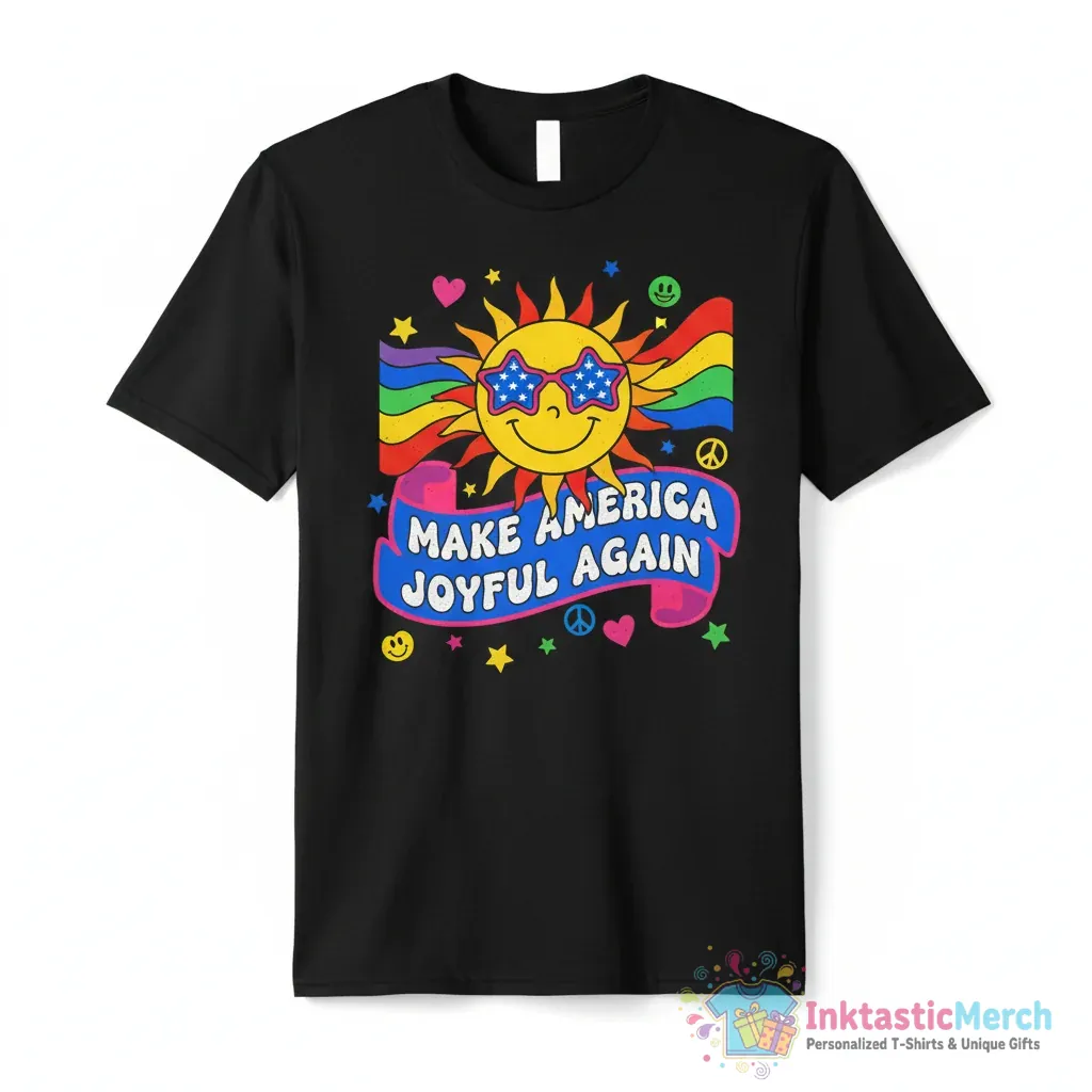 Share your message of positivity with the Make America Joyful Again T-shirt. This premium quality tee is more than just clothing; it’s a statement of optimism and a way to spread good vibes wherever you go. Designed for comfort and style, it’s perfect for anyone who believes in the power of joy. Wear your heart on your sleeve and inspire those around you with this uplifting design.