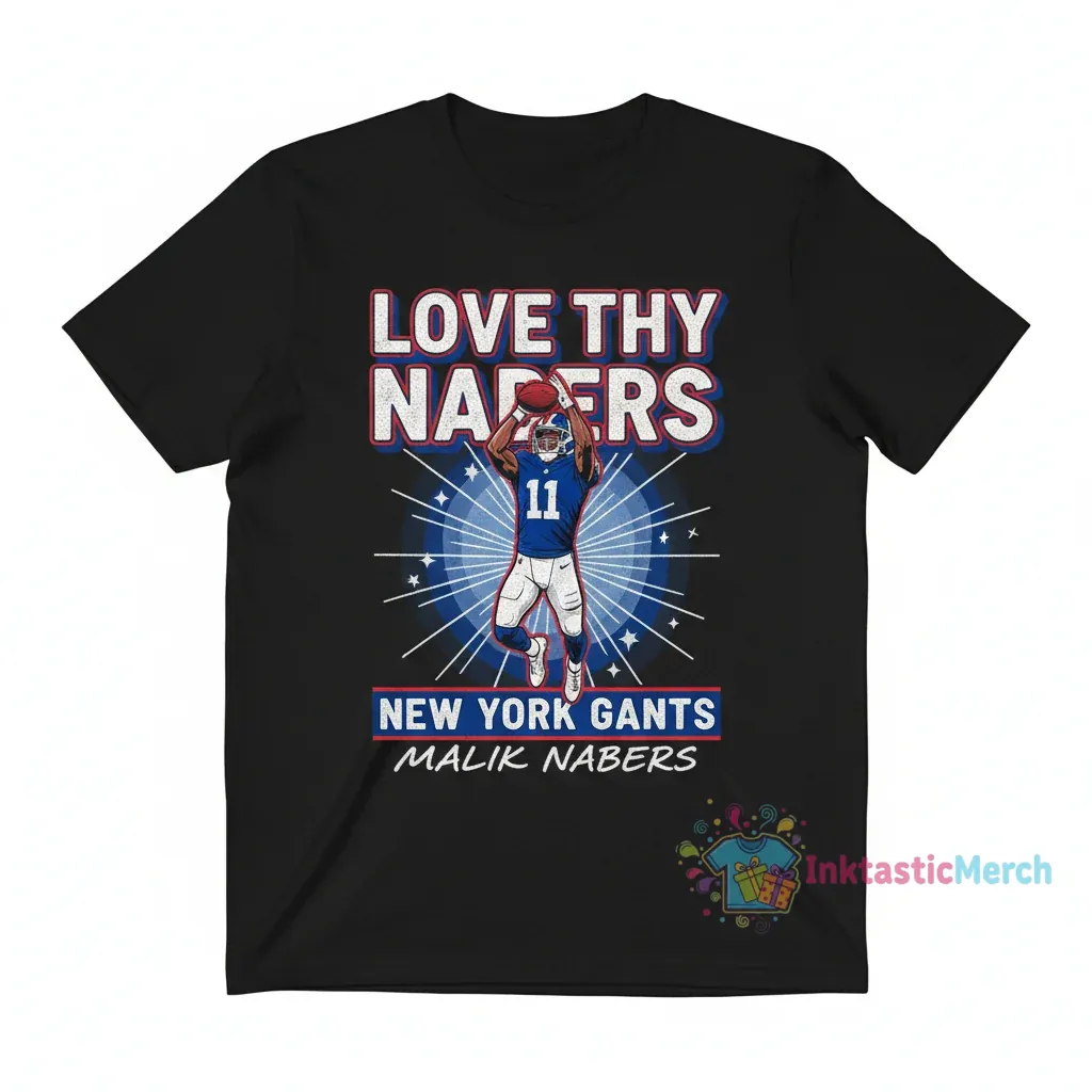 Malik Nabers, New York Giants, and the electrifying energy of the game – this shirt is born from a passion for iconic moments. ‘Love Thy Nabers’ isn’t just a slogan; it’s a celebration of the spirit and skill that captivates fans. We wanted to capture that electrifying feeling of seeing Nabers make a play, translating that raw excitement into a wearable piece of art. This design is a tribute to the dedication, the thrill, and the undeniable talent that defines a rising star. It’s for the fans who live and breathe the game, who feel every touchdown, every incredible catch. Wear your allegiance with pride and connect with the energy that fuels the Giants Nation.
