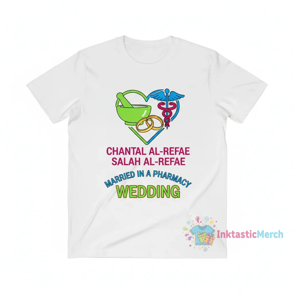 To maintain the quality and longevity of your ‘Married in a Pharmacy Wedding Chantal Al-Refae Salah Al-Refae’ t-shirt, machine wash cold with like colors and tumble dry low. For best results, wash inside out. This t-shirt is incredibly versatile, perfect for casual outings, themed parties, anniversaries, or simply as a comfortable everyday piece. Pair it with jeans, shorts, or layer it under a jacket for a complete look. It makes a thoughtful and unique gift for the newlyweds or anyone who was part of this special pharmacy wedding.
