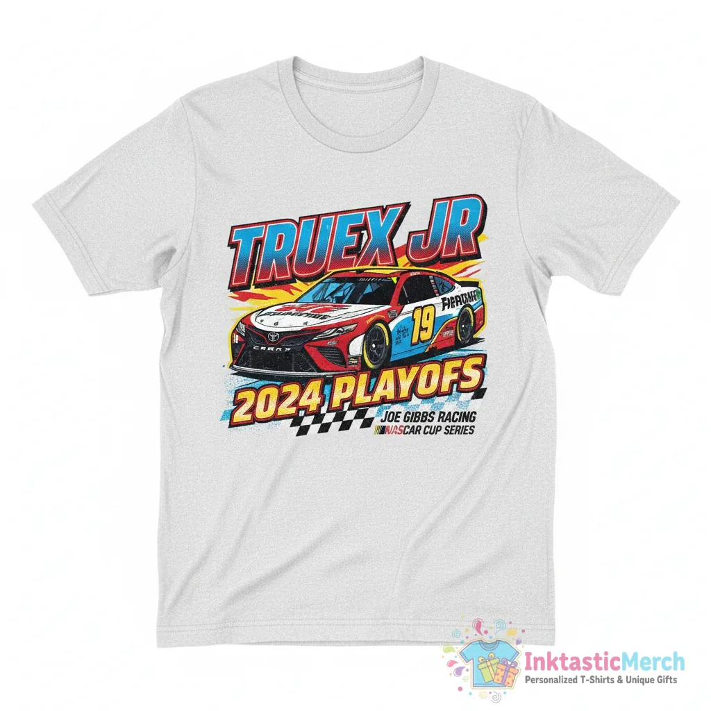 Show your unwavering support for Martin Truex Jr. and the Joe Gibbs Racing Team with this exclusive 2024 NASCAR Cup Series Playoffs T-shirt. Crafted from incredibly soft, breathable fabric and featuring a high-quality, durable print, this tee offers maximum comfort and a classic unisex fit perfect for any fan. Explore more premium apparel and official team gear at inktasticmerch.com.