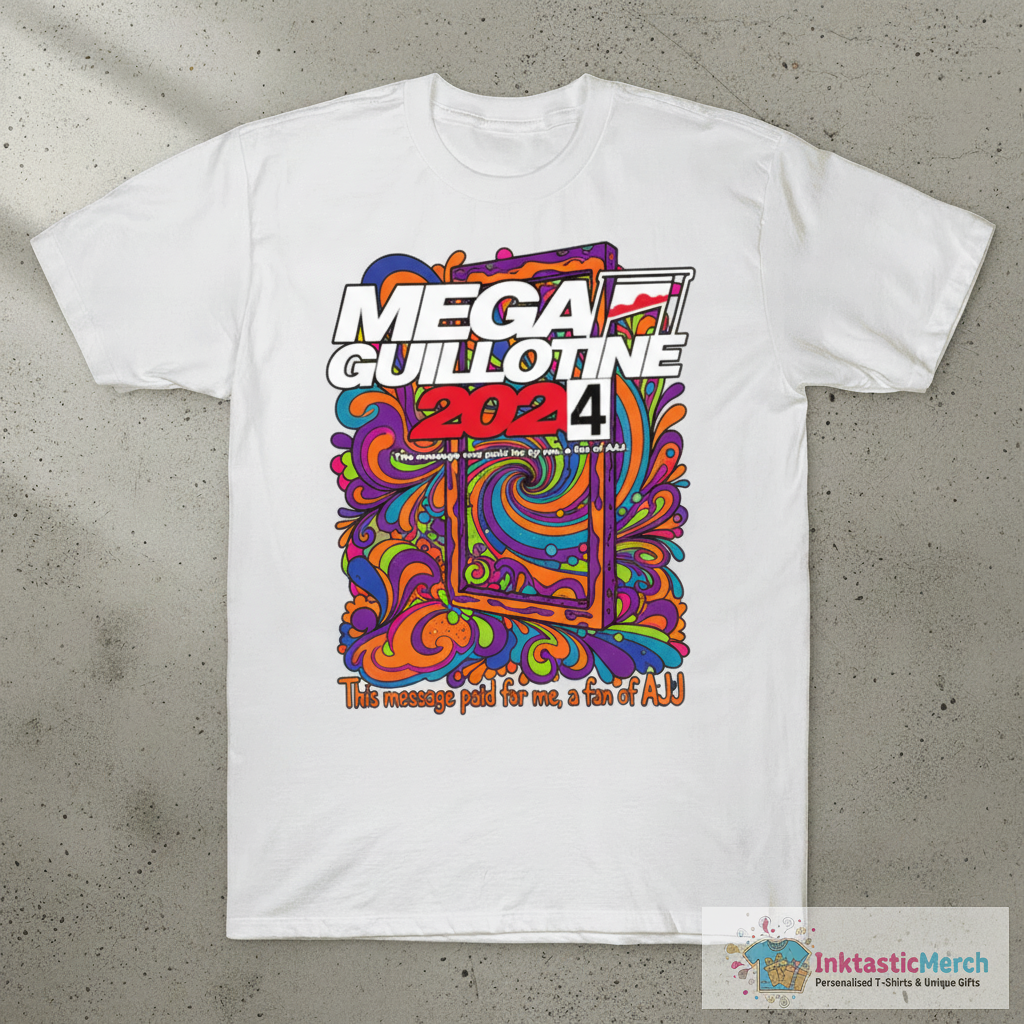 Show your support for AJJ with the Mega Guillotine 2024 T-shirt, crafted for ultimate comfort and a relaxed vibe. Made with super-soft, high-quality fabric, this tee ensures durability and a flattering unisex fit, perfect for concerts or casual hangouts. Discover more fan-favorite merchandise at inktasticmerch.com.