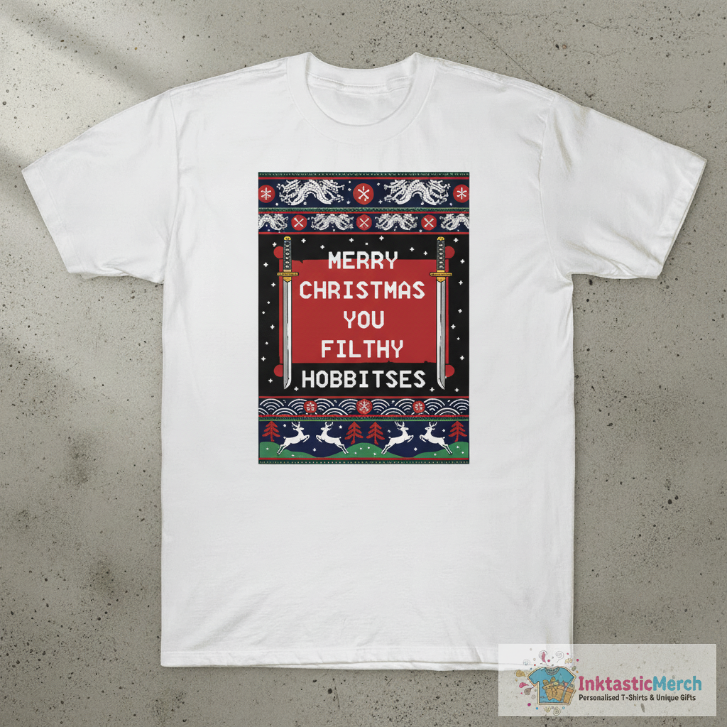 Bring your style to life with the Merry Christmas You Filthy Hobbitses Ugly Sweater T-shirt today!