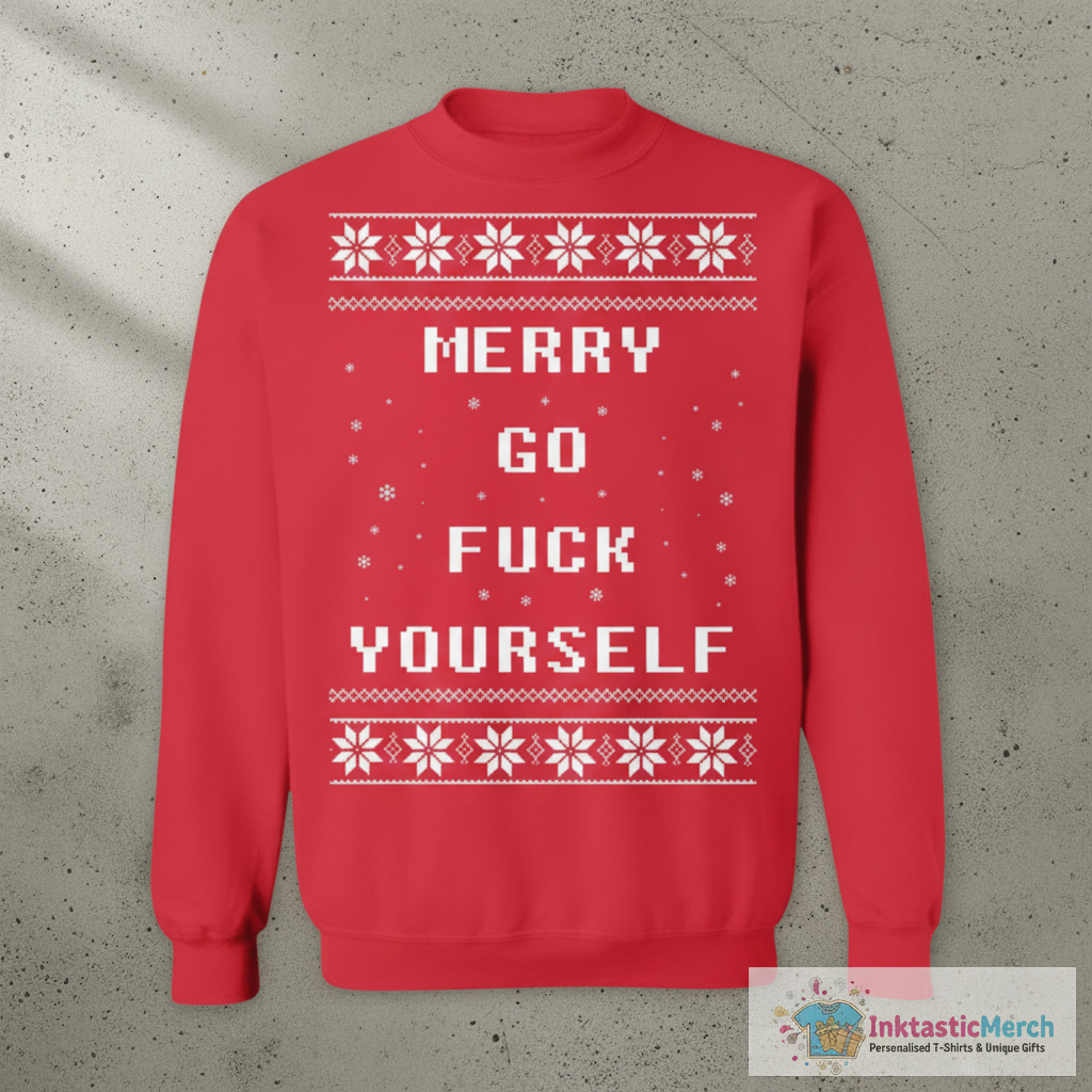- Unique and humorous “Merry go F*ck yourself Christmas sweater” graphic