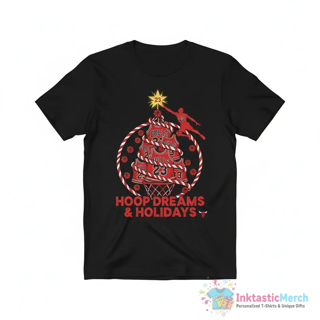 Celebrate the holidays with a legendary vibe in this awesome Michael Jordan Christmas tree T-shirt. Inspired by the Chicago Bulls and the NBA, this tee is perfect for any basketball fan looking to add some festive flair to their wardrobe. It’s more than just a shirt; it’s a statement piece that blends iconic sports history with holiday cheer.