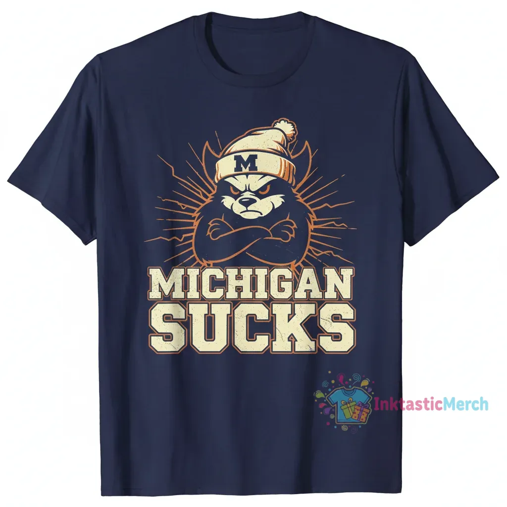 - Bold “Michigan Sucks” cream text design