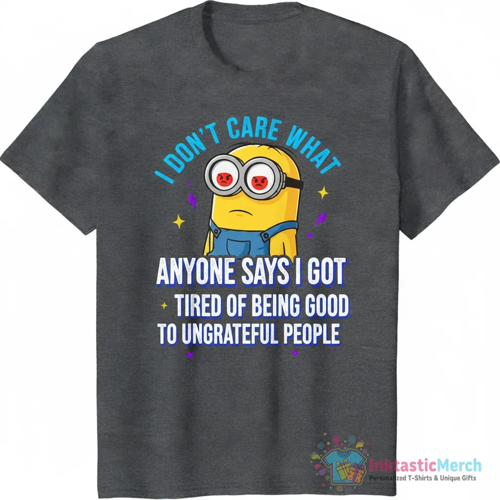 Show off your new attitude with the Minion I don’t care what anyone says I got tired of being good to ungrateful people shirt from InktasticMerch. Made with super soft, high-quality fabric, it feels as good as it looks, offering ultimate comfort and lasting style with a unique Minion graphic that lets you express yourself with confidence and humor.