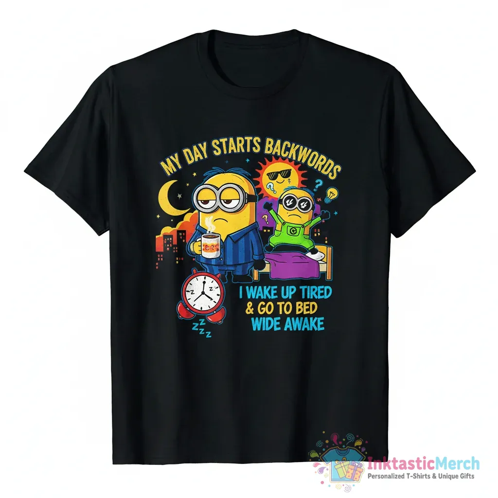 Start your day with a laugh in the hilarious Minion “My Day Starts Backwards” T-shirt! This tee perfectly captures that feeling of being wide awake when you should be asleep, featuring a relatable Minion quote. Made from premium quality fabric, this shirt isn’t just funny – it’s incredibly comfortable. Its classic design makes it a go-to option for casual outings, lounging at home, or showing off your love for everyone’s favorite yellow mischief-makers. Get ready to turn heads and spark conversations with this unique and eye-catching piece.