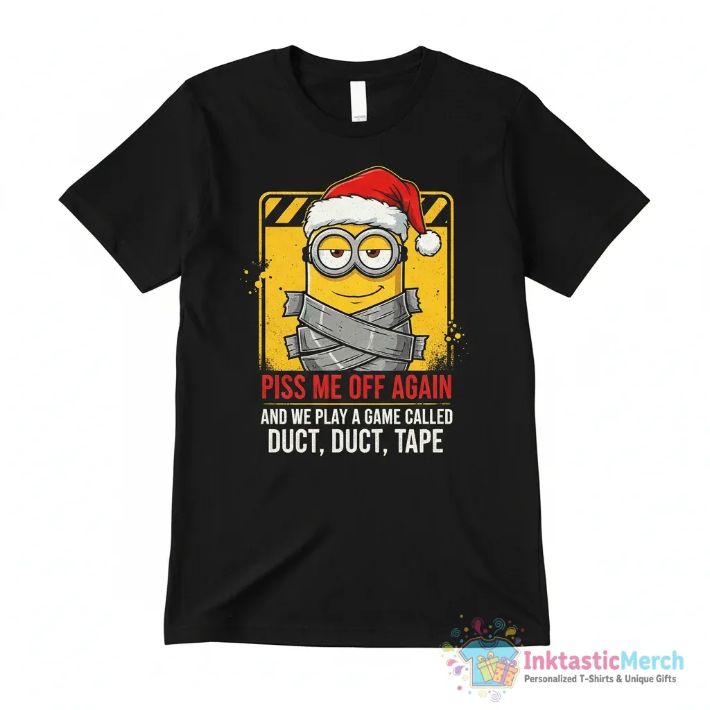 Get ready for the holidays with the “Minion Santa hat piss me off again and we play a game duct duct tape shirt” from InktasticMerch. Crafted from super-soft, high-quality fabric with a durable print, this tee offers exceptional comfort and lasting style. It’s a statement piece designed for fun, perfect for anyone who loves a good laugh and a touch of pop culture.