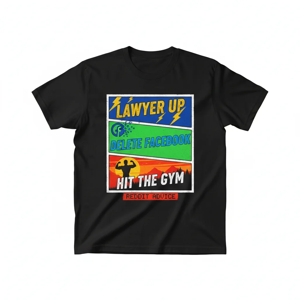 Lawyer Up, Delete Facebook, Hit The Gym – it’s more than just advice; it’s a modern mantra for taking back control. Born from the collective wisdom of the internet, this phrase has become a powerful symbol of self-improvement and resilience. We captured that raw, empowering energy in this piece of original artwork. This isn’t just a t-shirt; it’s a wearable reminder of your own strength and the simple, bold steps you can take to rebuild and reclaim your story. It’s for anyone who has ever faced a challenge and decided to rise above it.
