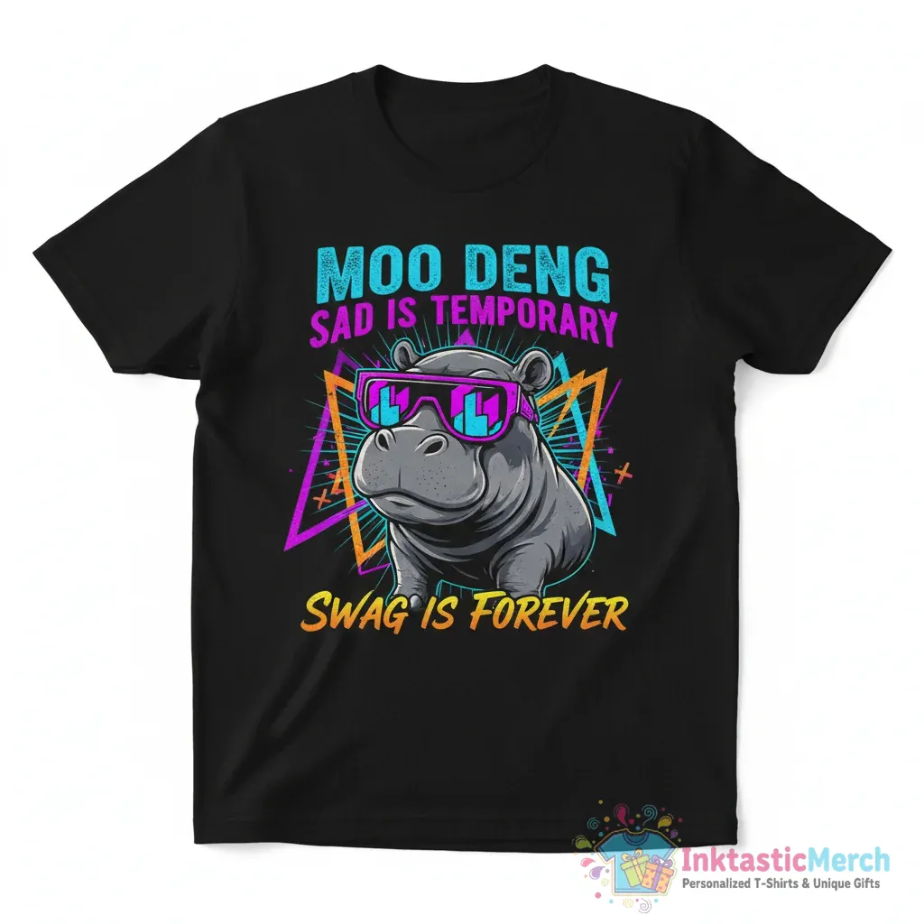 - Unique Graphic Design: Features the eye-catching “Moo Deng sad is temporary swag is forever” artwork.